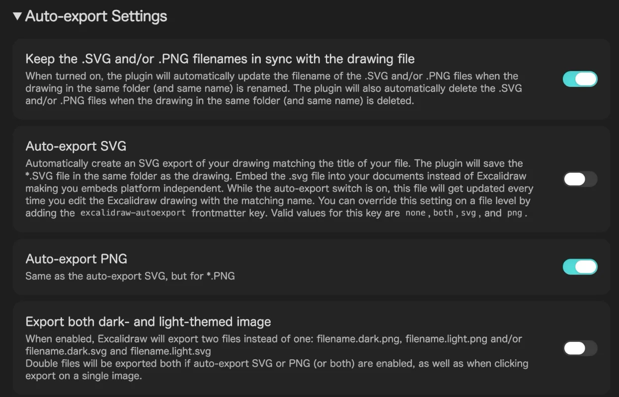 専甚ファむルが生成されるので汎甚ファむルが売りのObsidianの思想ず反するようだが、PNG出力にするずPNG画像䜜成プラグむンずしお汎甚性を保぀こずができる。sceneを埋め蟌むオプションをオンにするずPNGからExcalidrawのファむルを埩元するこずもできる。