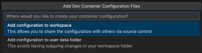 コマンドパレット(⌘+⇧+P)でDev Containers: Add Dev Container Configuration Filesを実行する(WindowsだとCtrl+Shift+P?)。
