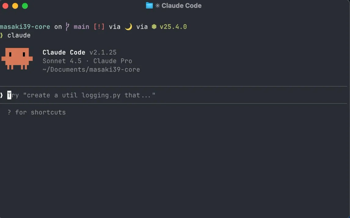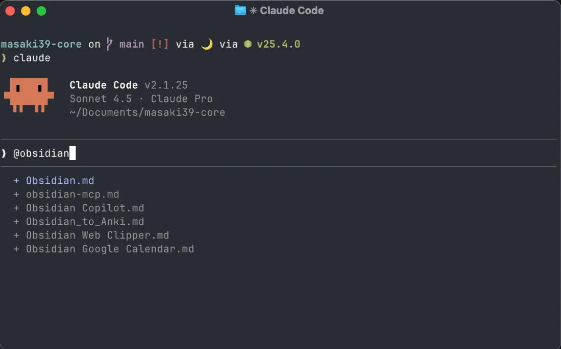 ターミナルでVaultのディレクトリに移動して、claudeと打つとClaude Codeが起動する。