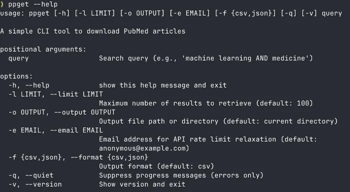 ppgetを使えば、PubMedからのデータ取得が一行のコマンドで完結する。uvがインストールされている場合はuvx ppget "検索語句"
